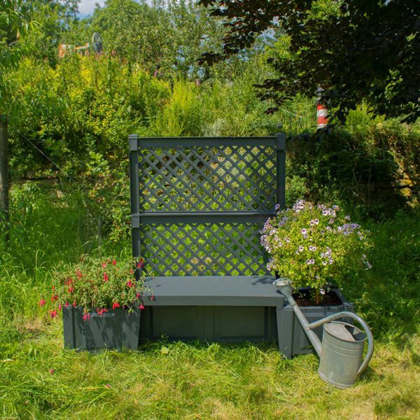 Die Gartenbank ist aus pflegeleichtem und wetterfesten Kunststoff hergestellt. Die Sitzmöglichkeit ist nicht nur bequem, sondern kann auch ganz individuell bepflanzt werden. Genießen Sie die Schönheit Ihres Gartens bei einer wohlverdienten Pause. Die Montage ist leicht und ohne Werkzeug durchführbar. Im Set enthalten sind – neben der Sitzfläche – zwei Pflanzkästen sowie eine Rückwand in Form eines Spaliers.