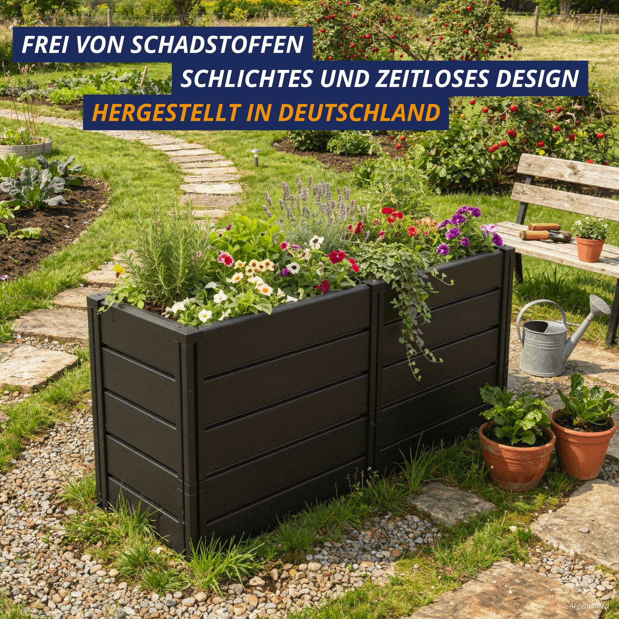 Die anthrazitfarbene Oberfläche in moderner Holzoptik fügt sich harmonisch in jede Gartenumgebung ein. Gleichzeitig ist das Hochbeet frei von Schadstoffen und somit ideal für den Anbau von Lebensmitteln geeignet.