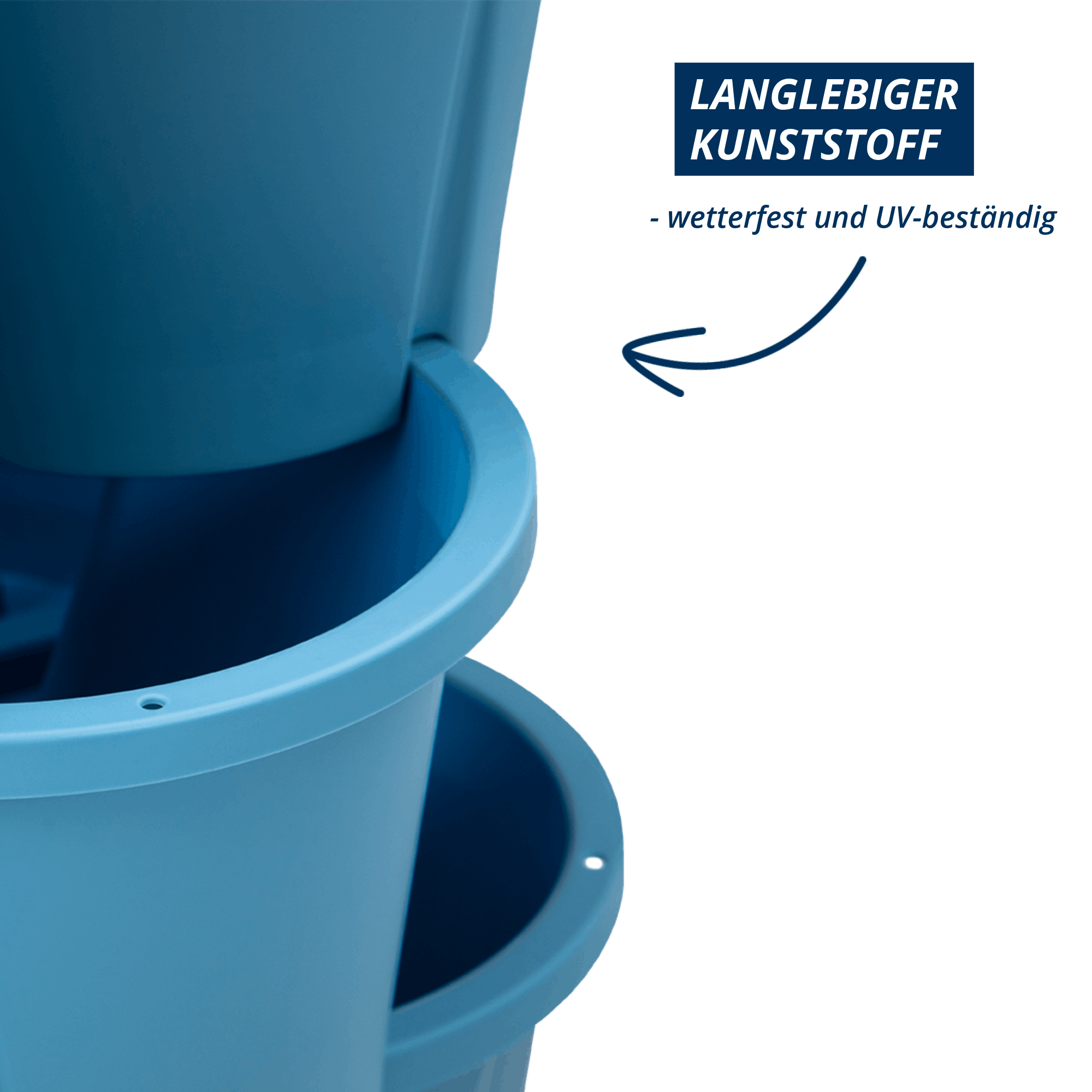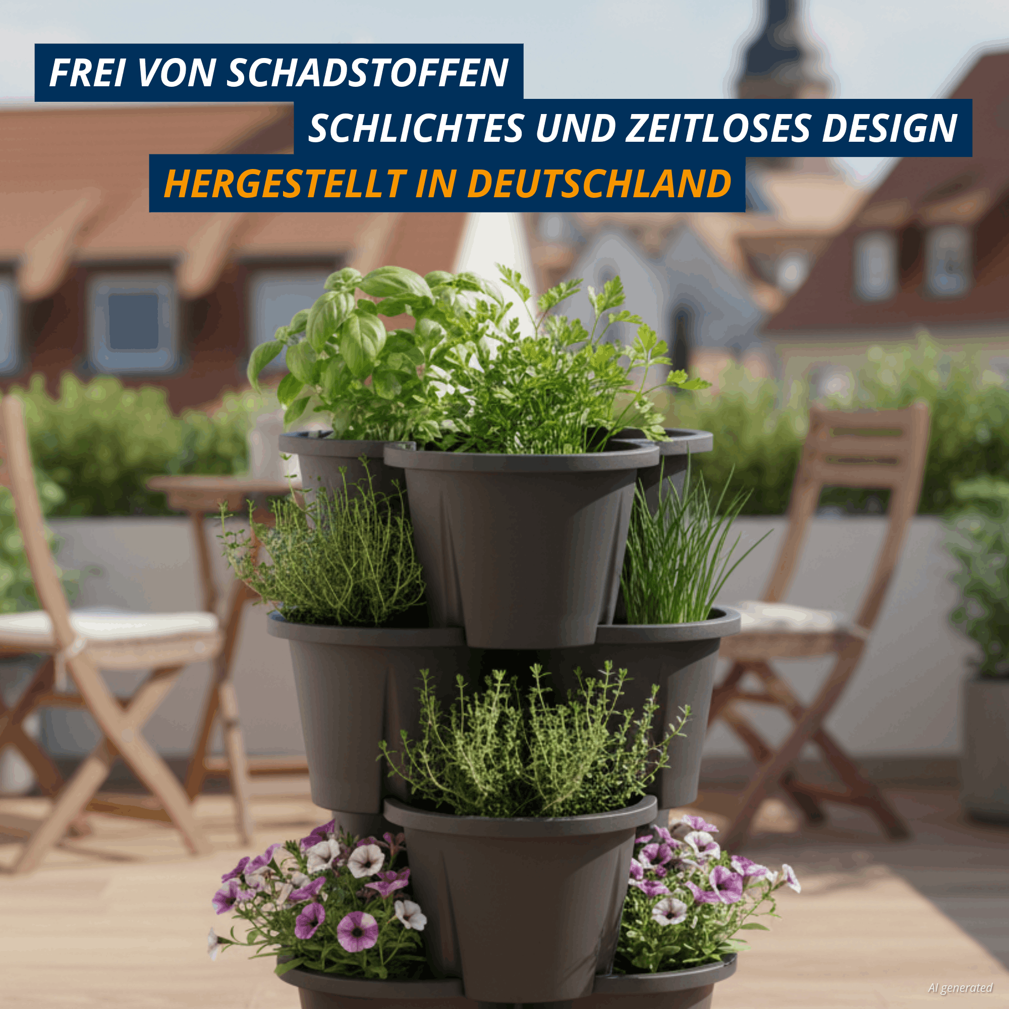 Der Pflanzturm Demeter ist die platzsparende Lösung für vertikales Gärtnern auf Balkon, Terrasse oder im Garten. Mit nur 43 cm Durchmesser und 66 cm Höhe bietet er ein großzügiges Pflanzvolumen von 54 Litern (13,5 Liter je Element) und schafft optimale Bedingungen für Kräuter, Erdbeeren, Blumen oder kleine Gemüsesorten. Das integrierte Wasserreservoir speichert Feuchtigkeit direkt im Gefäß und unterstützt eine gleichmäßige Versorgung der Pflanzen; bei Bedarf kann es aufgebohrt werden.