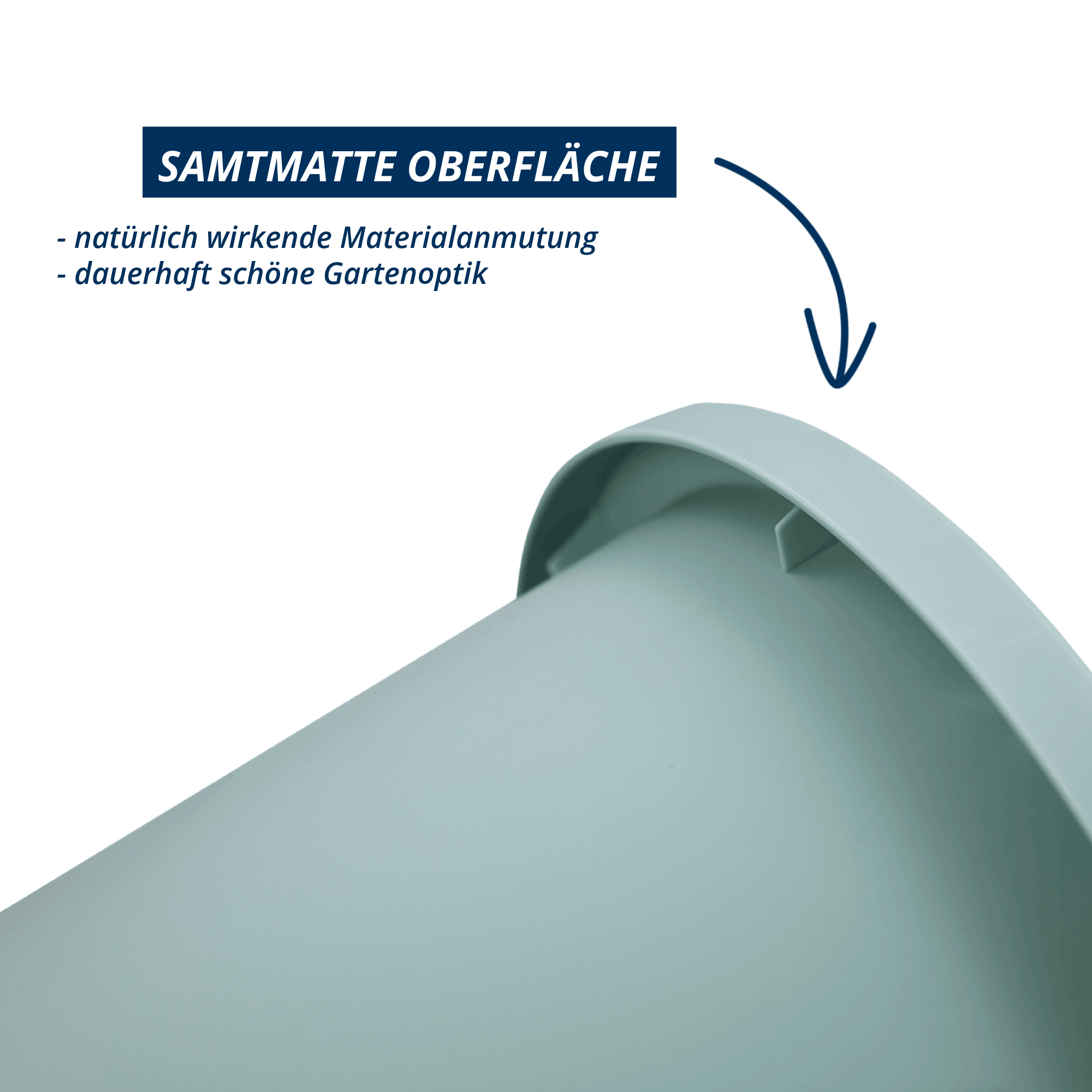Dank des werkzeuglosen Stecksystems lässt sich der Turm einfach montieren und flexibel stapeln. Der langlebige, wetterfeste und UV-beständige Kunststoff sorgt für dauerhafte Formstabilität, während die samtmatte Oberfläche mit natürlicher Materialanmutung eine hochwertige, zeitlose Optik verleiht. Der Pflanzturm ist frei von Schadstoffen und wird in Deutschland hergestellt – erhältlich in Anthrazit, Meerblau und Pastellmintgrün.