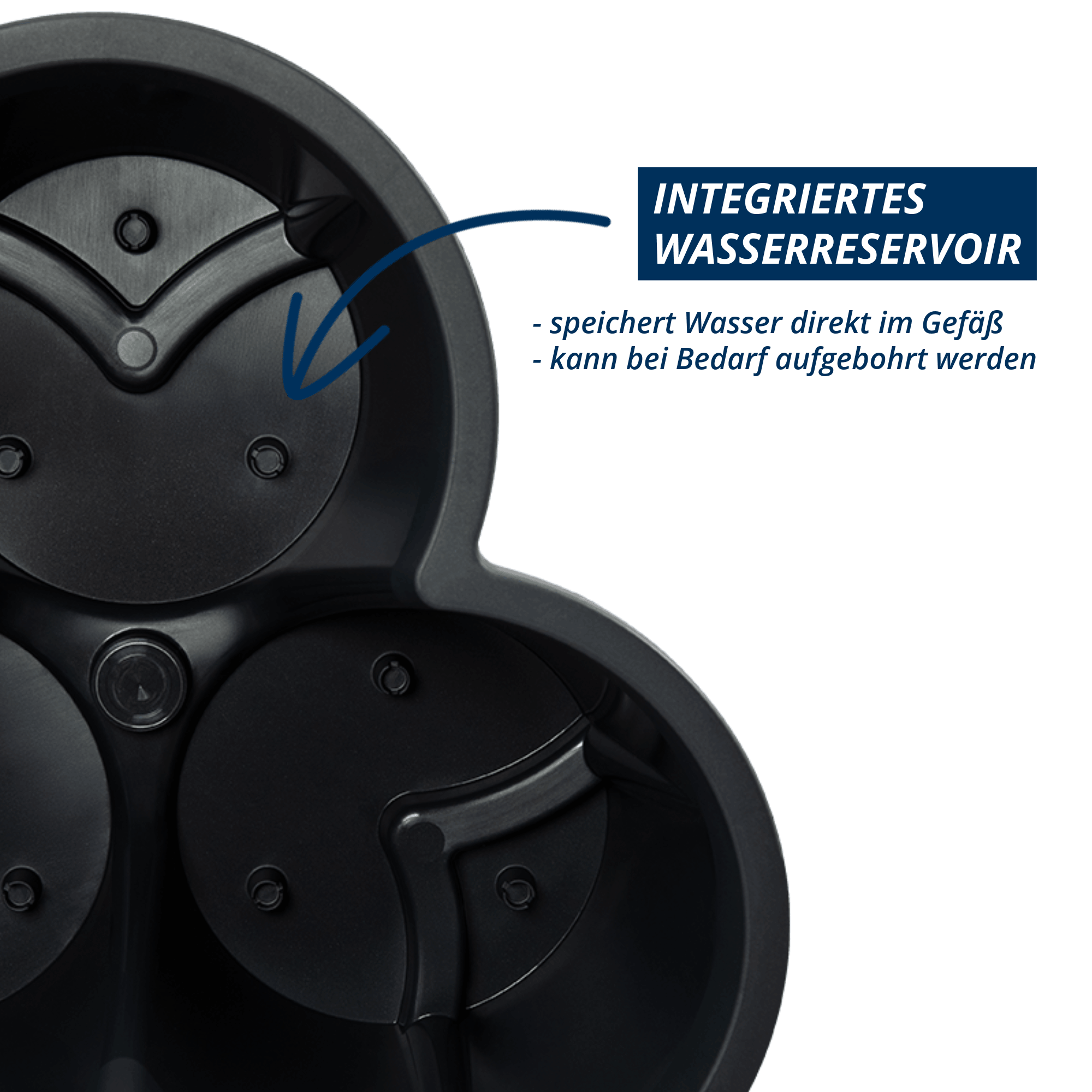 - Integriertes Wasserreservoir – speichert Feuchtigkeit direkt im Gefäß, bei Bedarf aufbohrbar